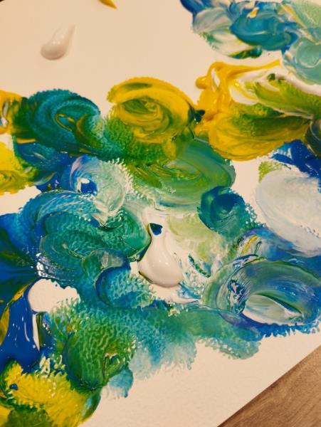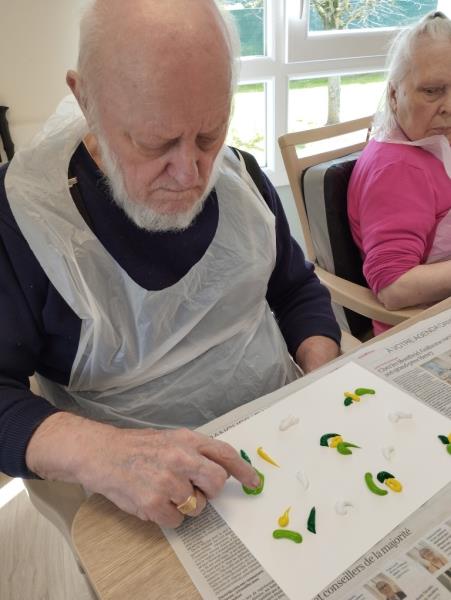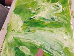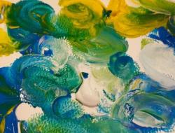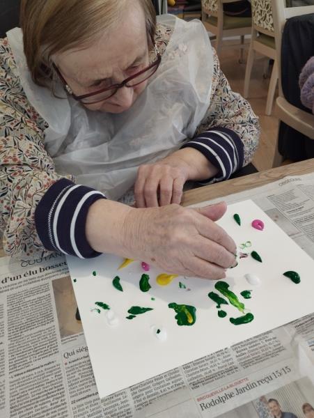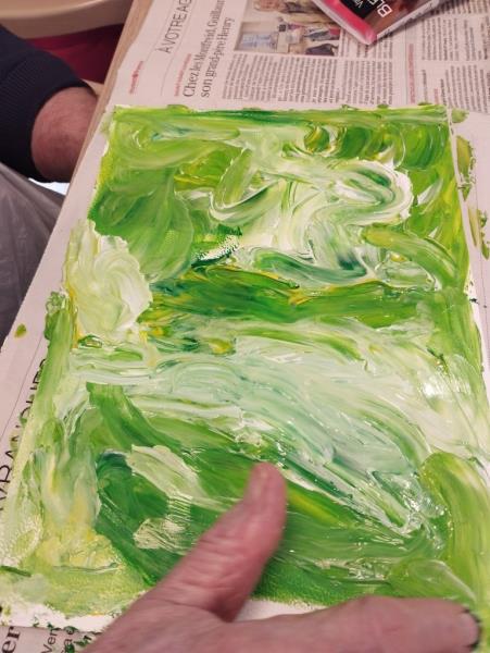 Le contact de la gouache est très agréable car elle glisse sur le papier et caresse la pulpe des doigts. L'animatrice du PASA était là pour remettre de la gouache aussi souvent que nécessaire afin de laisser s'exprimer les idées printanières à l'œuvre.