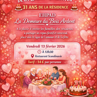Publiée le 06/02/2026Nous avons le plaisir de vous proposer de nous rejoindre le vendredi 13 février à partir de 12h30 pour un repas festif en l'honneur de 2 évènements : - l'anniversaire de la résidence (et oui, c'est la date officielle !) - la fête des amoureux encore appelée Saint Valentin Pour ces deux [...] Lire la suite