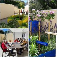 Publiée le 08/06/2021En ce beau samedi de juin, nous avons proposé à quelques résidents qui le souhaitaient de s'installer au jardin pour le déjeuner. Malgré une petite bise légère, le repas en terrasse a été apprécié! Petit focus sur le jardin bleu et le jardin jaune, ils commencent à ê [...] Lire la suite