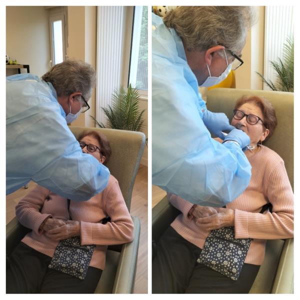 Une aide-soignante, référente bucco-dentaire, accompagne le praticien et le résident et prend en note les consignes indiquées par le dentiste en termes de soins quotidien à apporter, le cas échéant.